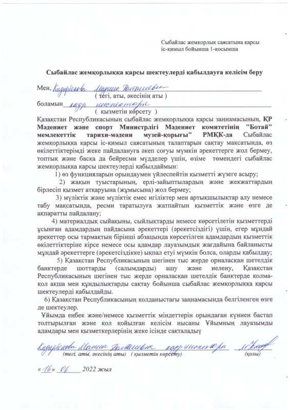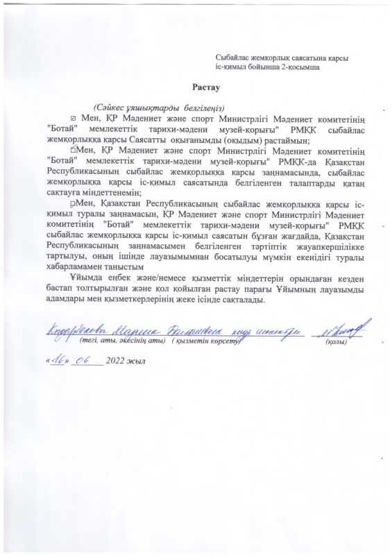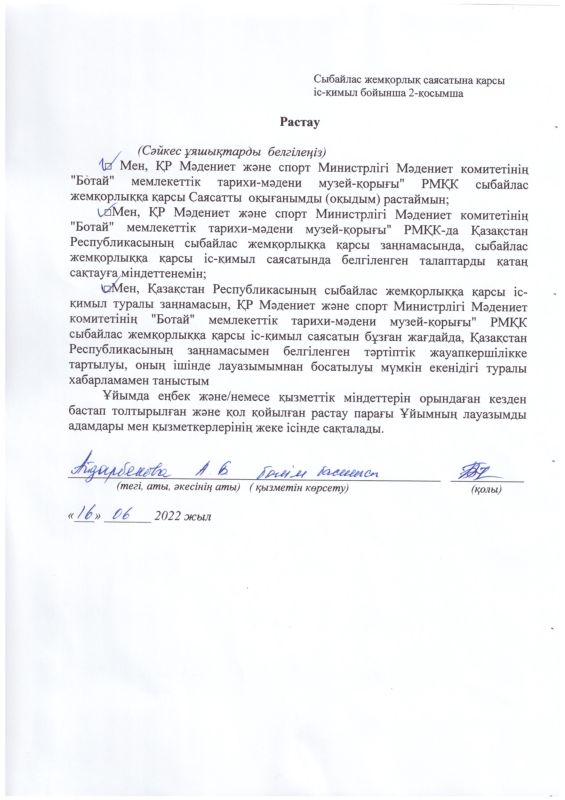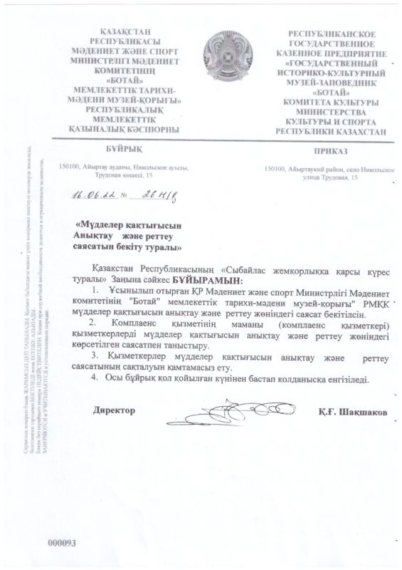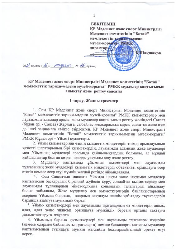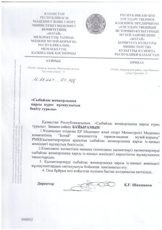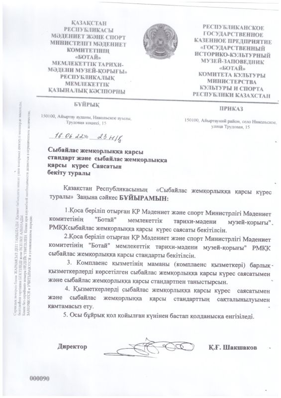 РГКП Государственный историко-культурный музей заповедник "Ботай" Министерства культуры и информации Комитета культуры РК действует телефон доверия, по которому можно сообщить о фактах коррупционного характера и других правонарушениях, допущенных сотрудниками РГКП Государственный историко-культурный музеем-заповедником "Ботай" телефон: +77153322880
