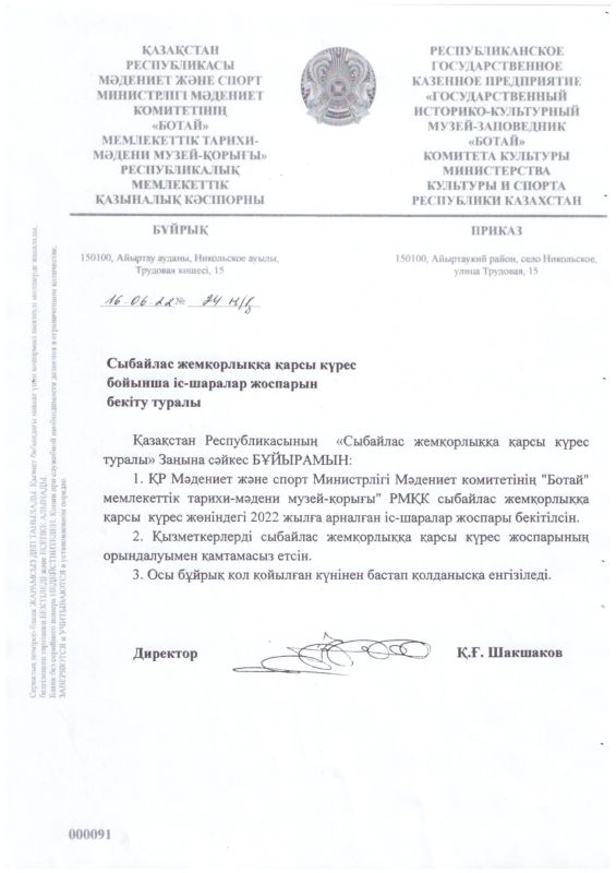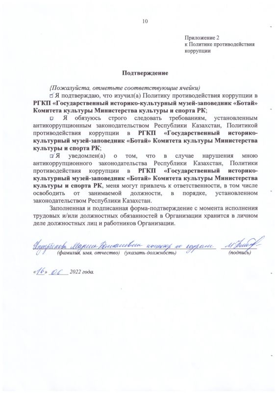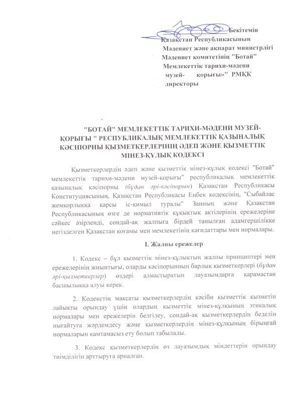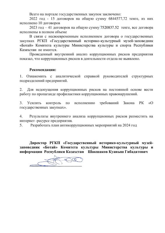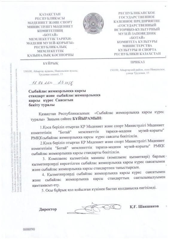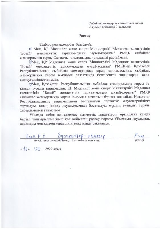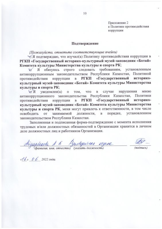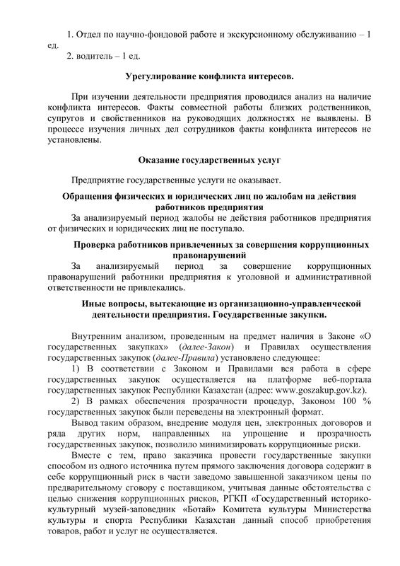 РГКП Государственный историко-культурный музей заповедник "Ботай" Министерства культуры и информации Комитета культуры РК действует телефон доверия, по которому можно сообщить о фактах коррупционного характера и других правонарушениях, допущенных сотрудниками РГКП Государственный историко-культурный музеем-заповедником "Ботай" телефон: +77153322880