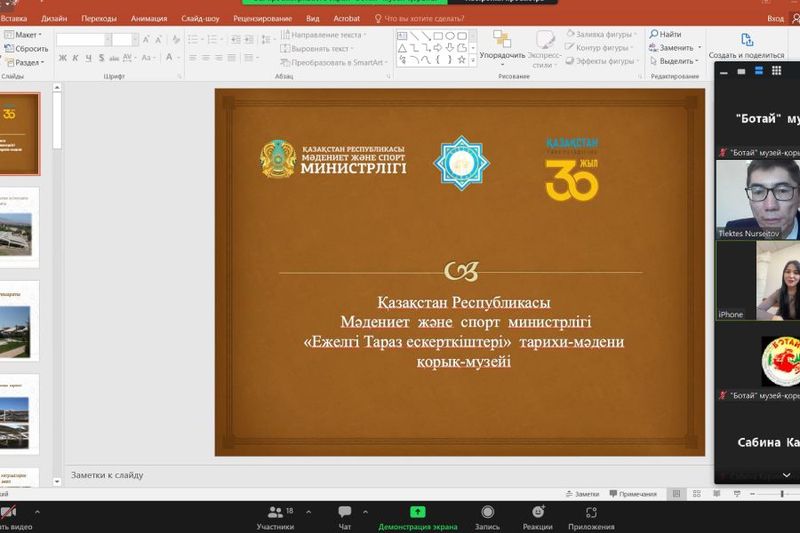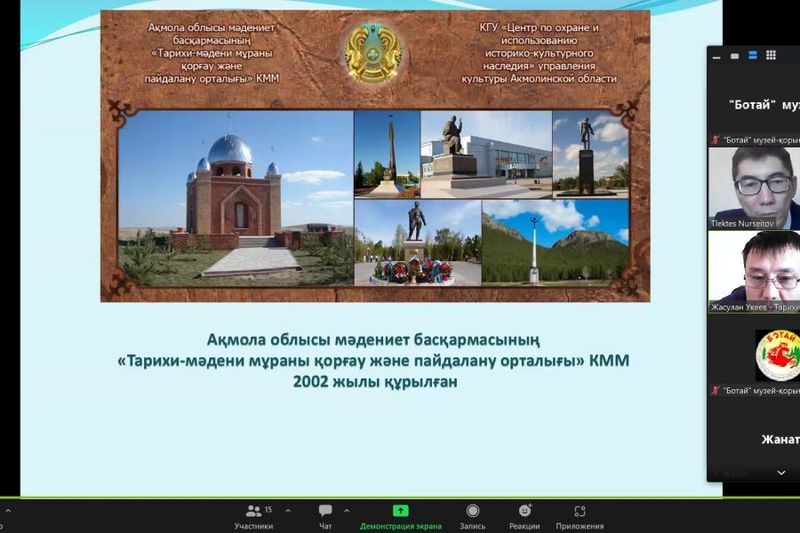 В мероприятии приняли участие сотрудники музейных организаций, археологи, историки, научные работники регионов РК. Цель мероприятия – выявить и обсудить наиболее актуальные темы музеев-заповедников в деле сохранения исторического наследия Республики Казахстан. Поделиться с коллегами о современных методиках изучения и популяризации богатого исторического наследия Казахстана. Исследования в археологии на стыке наук - междисциплинарный поход, методики сохранения объектов. Например, опытом консервации и музеефикации Некрополя Кызыл-Оба поделился заведующий отделом КГУ «Центр по охране и использованию историко-культурного наследия» управления культуры, развития языков и архивного дела акимата СКО Баймусенов Ж.О. Научными данными о найденых уникальных артефактах сакского периода поделился Укеев Ж.К. - директор Центра по охране и использованию историко-культурного наследия Акмолинской области. Кроме того, на республиканской онлайн-конференции обсуждались методы актуализации и модернизации опыта работы, накопленного в областных центрах охраны памятников, республиканских музеях-заповедниках.