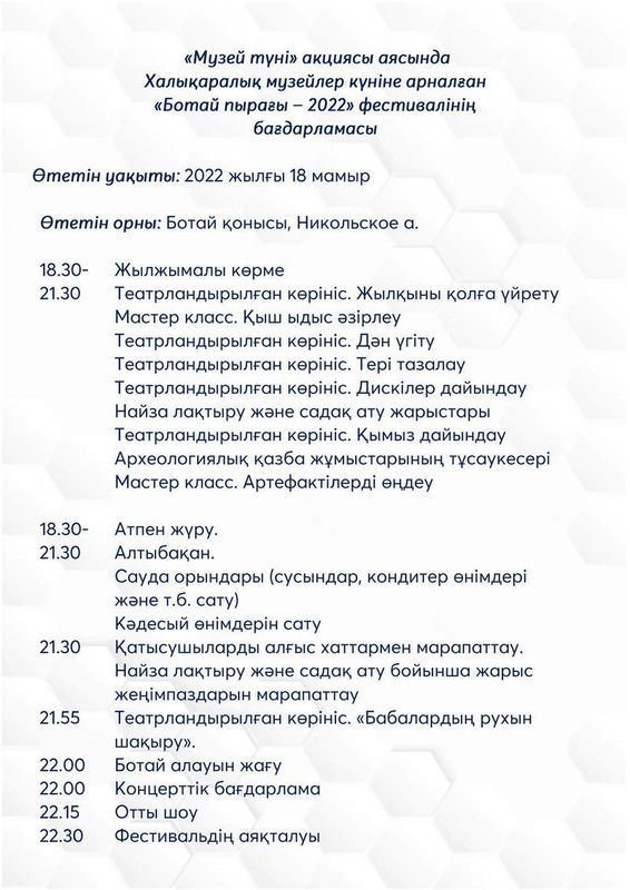 Программа фестиваля «Ботай пырағы – 2022», посвященный к Международному дню музеев.Создано: 12.05.2022, 11:07 | Просмотров: 426