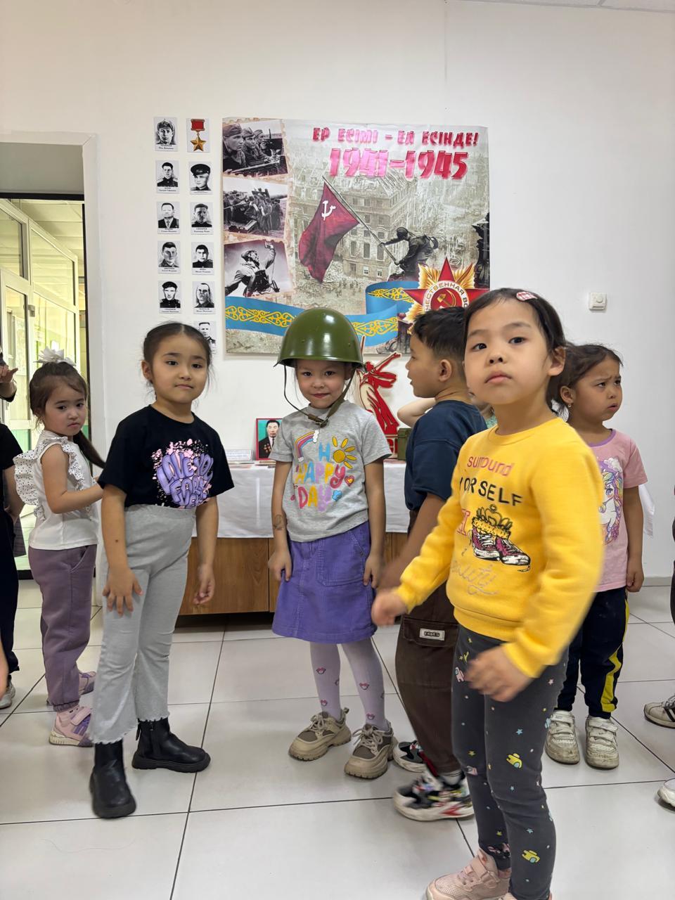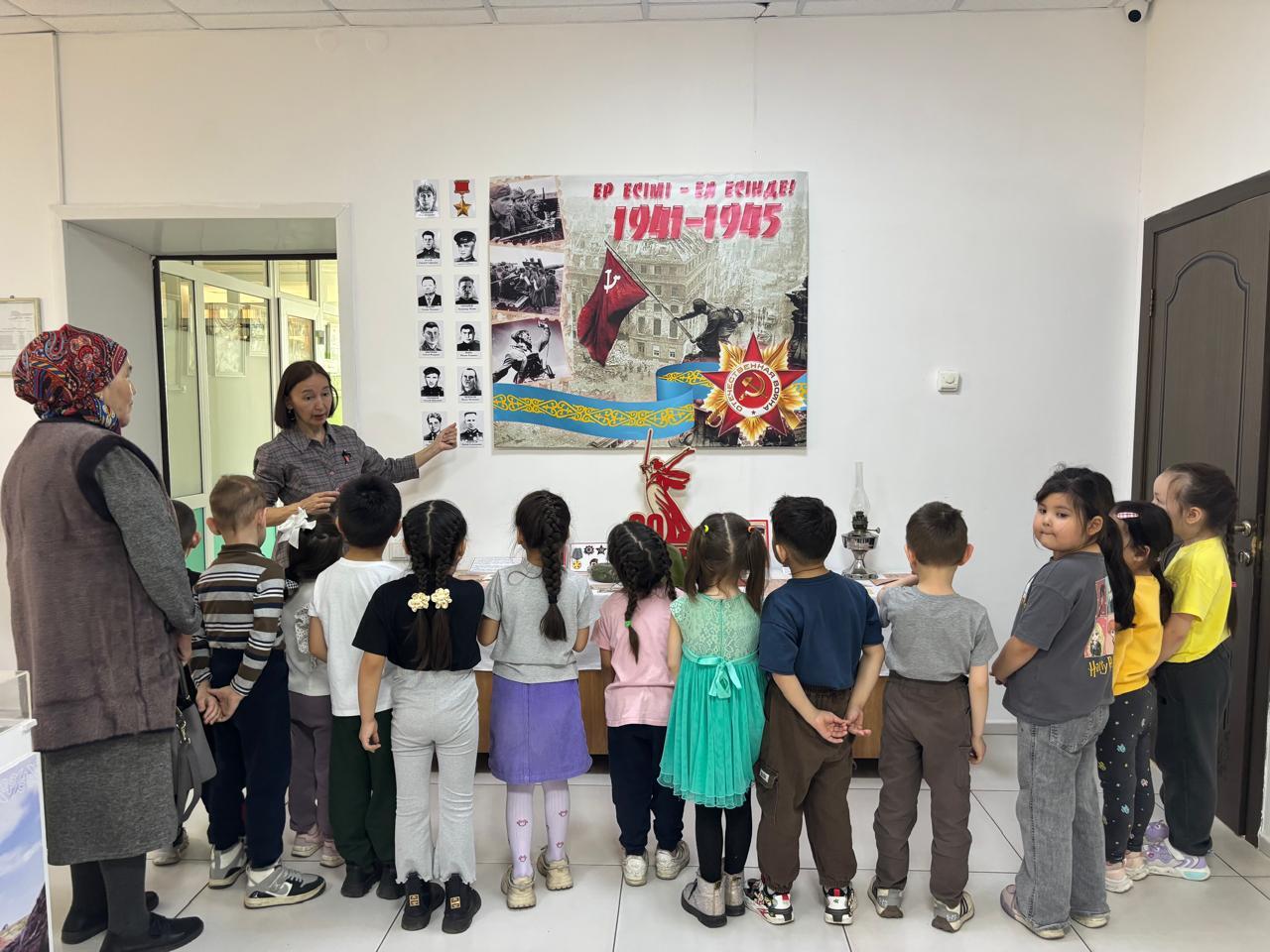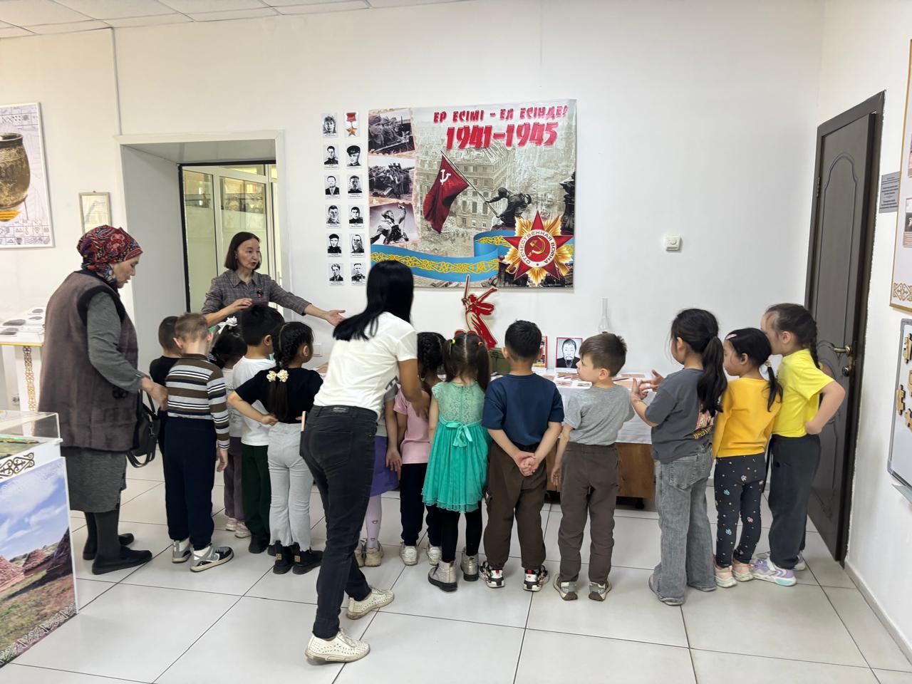Также малыши посетили выставку «Никто не забыт, ничто не забыто!" в рамках республиканской акции «Ер Есімі-ел есінде», посвященной 80-летию Победы в Великой Отечественной войне.