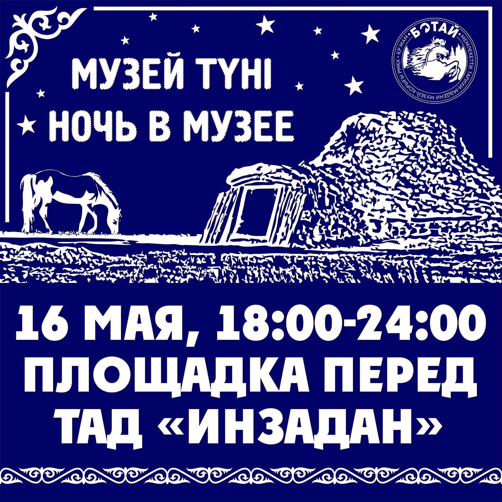 В рамках акции «Ночь музеев», приуроченной к Международному дню музеев, праздничное мероприятие «Ночь Ботая» пройдет для жителей и гостей села Саумалколь 16 мая в 18.00ч. перед площадкой торгового административного центра «Инзадан»