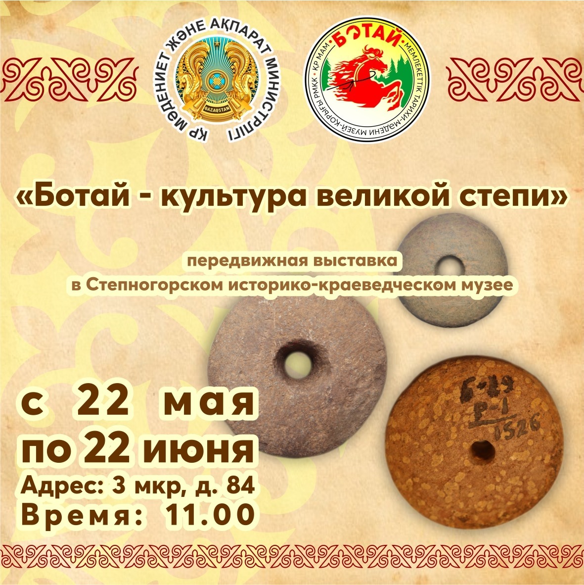 РГКП «Государственный историко-культурный музей-заповедник» Ботай» комитета культуры МКИ РК приглашает на открытие выездной выставки «Ботай-культура Великой степи», которая состоится 22 июня 2025 года в Степногорском историко-краеведческом музее г. Степногорска Акмолинской области.