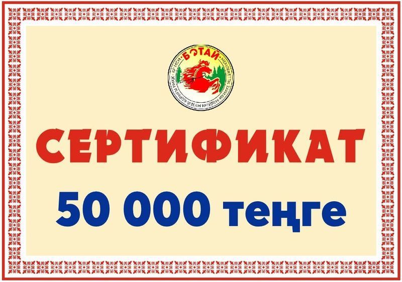 Благодарственное письмо директора музея-заповедника "Ботай" и денежный сертификат на сумму 50 000 тенге -