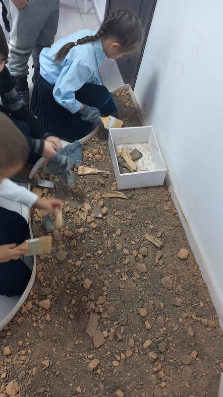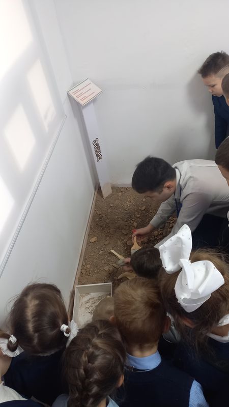 В ходе экскурсии была представлена инсталляция "археологические исследования Ботайской культуры", где учащиеся смогли окунуться в мир истории и принять участие в археологических раскопках.