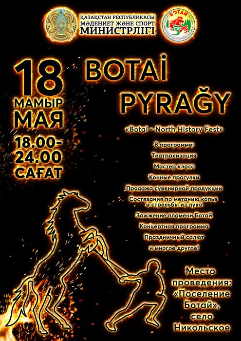 «Ботай» мемлекеттік тарихи-мәдени музей-қорығы «Музей түні» акциясы аясында 18 мамыр күні Халықаралық музейлер күніне арналған «Ботай пырағы – 2023» фестивалін өткізеді.