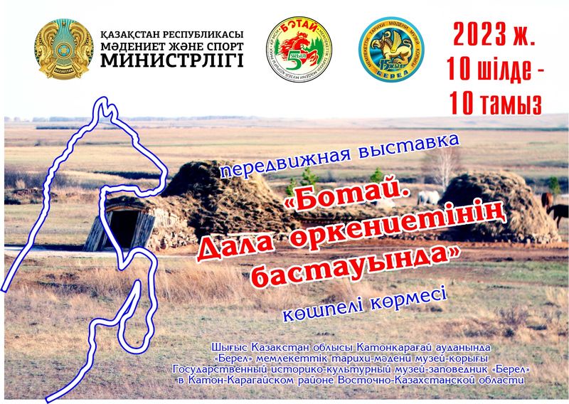 РГКП «Государственный историко-культурный музей-заповедник «Ботай» Комитета культуры МКС РК приглашает на торжественное открытие передвижной выставки «Ботай. У истоков степной цивилизации» которая состоится 10 июля 2023года в Государственном историко-культурном музее-заповеднике «Берел» в Катон-Карагайском районе Восточно-Казахстанской области.