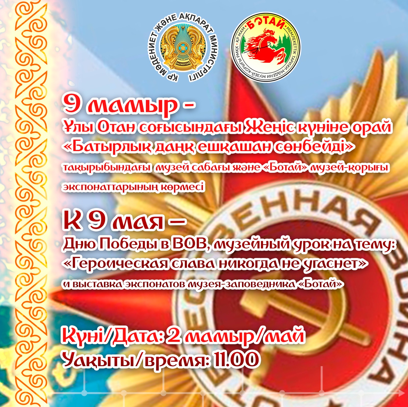 Сегодня, 2 мая текущего года, в средней школе села Комаровка Айыртауского района сотрудниками Государственного историко-культурного музея-заповедника «Ботай» в преддверии 9 мая-Дня Победы в Великой Отечественной войне был организован музейный урок на тему" Героическая слава никогда не угаснет "и выставка экспонатов музея-заповедника «Ботай».